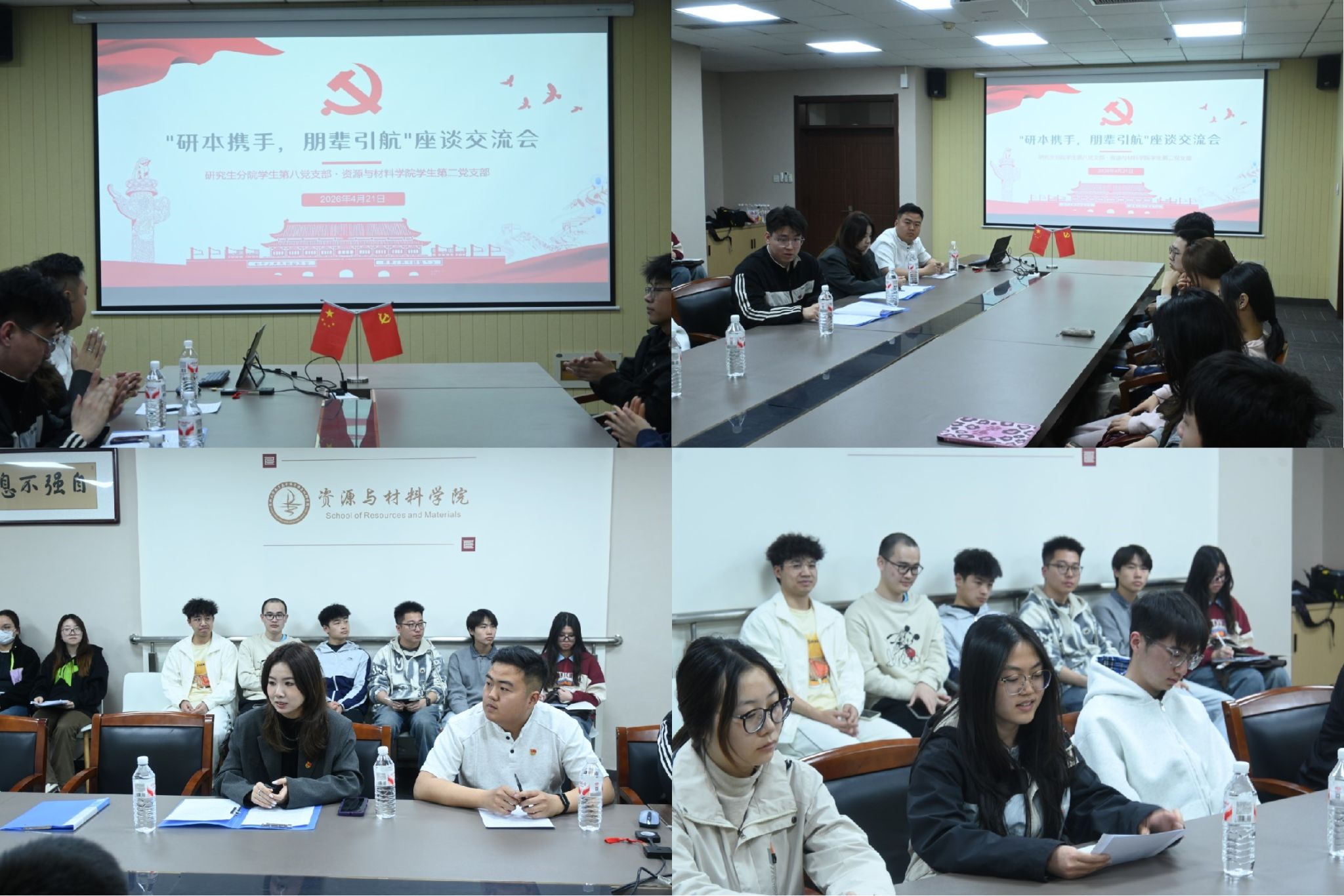 2026年4月21日晚19:00,研究生分院学生第八学生党支部联合资源与材料学院学生第二党支部,在综合楼901室举办“研本携手,朋辈引航”主题座谈交流会,两个支部全体党员参与本次座谈会。